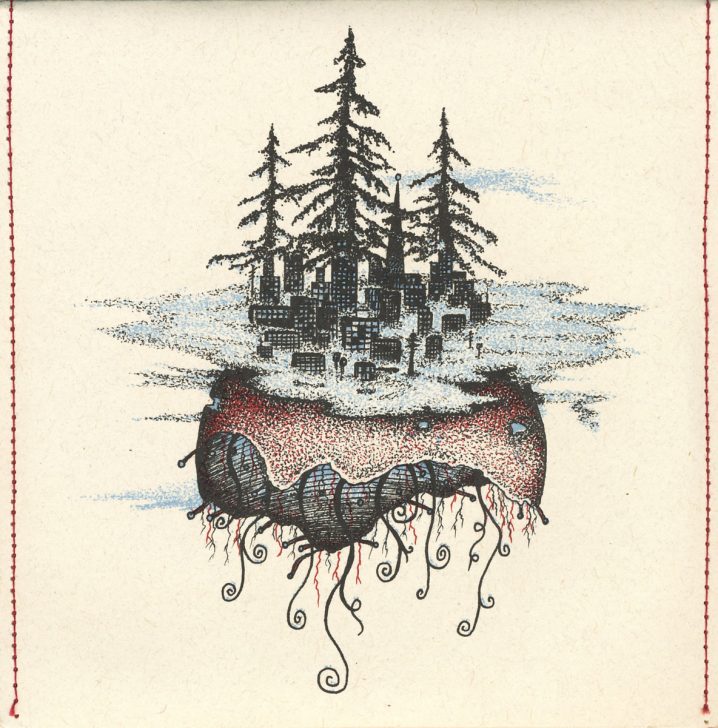 Here I want to applaud the art of Ray Massini, who has been printing the recycled paper covers with soy ink for every Somnia release. The illustration depicts an urban city rising above the skies, overgrown with evergreens, all floating on a piece of earth uprooted from its core. I need to get out. I need to withdraw. I need to return to my essential center of being. Where is my escape kit?