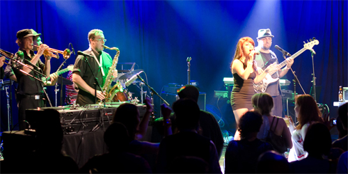 Next up was King Sunshine, a Montreal Toronto based nine-piece ensemble that got the house moving with their disco influenced funky jazz. Featuring Toronto pop artist, Maya Killtron (aka Miss Maya) on the mic, the band pulled in the crowd to the dance floor, blending deep house and techno influences into a an organic contemporary dance explosion. The physicality of sound penetrated the moving bodies, and I laughed as the brass instruments tried to compete with power of Maya’s voice. Towards the end of King Sunshine’s set, Peven Everett joined the band to lay down some of his smooth vocals. The soulful sessions and a few covers brought smiles to many faces, as people reached for their iPhones to take videos, check latest FB updates and send out a Tweet.