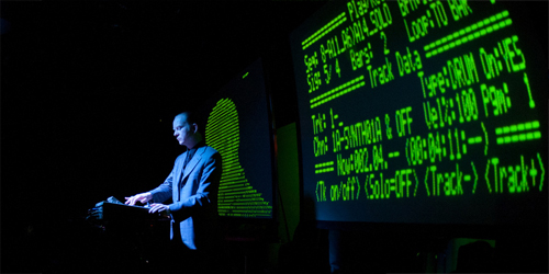 As Shigeto ended his performance, I glanced at my watch and realized that it was time to cab over to Re-Bar where Atom™ was about to perform. On the stage, 43-year old Schmidt, “the father of electrolatino, electrogospel and acid-reggaeton,” also known as Señor Coconut, stood behind his beloved Akai MPC, loading 4k patches, changing the frequency cut offs, and triggering the loops, as visual output of the sampler was broadcasted on the screen behind him, intertwined with real-time manipulated visuals created by Schmidt himself. Here was a green terminal ASCII art of Schmidt’s rotating head, pulsing in sync with the triggered sample of his now famous cell phone interference tone, with an occasional millisecond cutover to a pixelated scene of a man’s member in a woman’s mouth (think subliminal messages of Fight Club). At one point, Schmidt folded his hands along his precision ironed German suit and stood back watching the audience, as a short film played itself out on the screen. Yes, he wasn’t doing a damn thing for a period of ten minutes on the stage, but at least he wasn’t faking it! A unique performance to say the least!