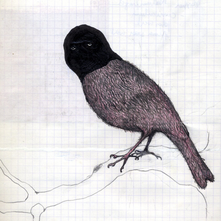 If you haven’t been properly spooked by the previously reviewed Grimoire from Kreng, well perhaps this little gem will do the trick. At times borderline creepy, the hair-raising screeching howls of Kaboom Karavan convey an atmosphere already painted on its cover (courtesy of the label’s head, Erik K Skodvin): an unidentifiable feathered being, with a dark hooded head and piercing (human) eyes stares back at us from its outlined tree-dwelling.