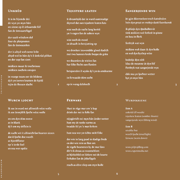 Besides the words by the above mentioned Kleefstra, the other three members of Piiptsjilling are Romke Kleefstra, Mariska Baars (aka Soccer Committee), and Rutger Zuydervelt (aka Machinefabriek). With haunting abstract paintings on the guitar, strange effects and various noises, the group of musicians create acoustic folktronica for distant lands and desolate places. The poetry comes and goes, drifting into the foreground of experimental sounds, then receding into the shadows of drones.