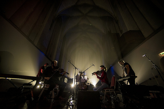 At the apse of the Janskerk (a church in Utrecht dedicated to John the Baptist), Dustin O’Halloran and Adam Wiltzie (of Stars of the Lid) were among a three-piece string orchestra, performing pieces from their latest album Atomos recently released on Erased Tapes and Kranky. The slow-paced movements reverberated against the Gothic interior, uplifting its Romanesque history with longing and hope. Deep bass penetrated the wooden pews eventually dissolving along the vibrant piano keys. Twenty minutes away Sebastian Plano was enchanting the audience with his take on modern classical sound. A cello with its own mounted controls soared and moaned, as Plano tapped out the glitchy rhythm on its pads. This may have been a favorite performance of the evening, and as I write these words, his last two albums on Denovali, Impetus and Arrhythmical Part of Hearts are queued up in my headphones.