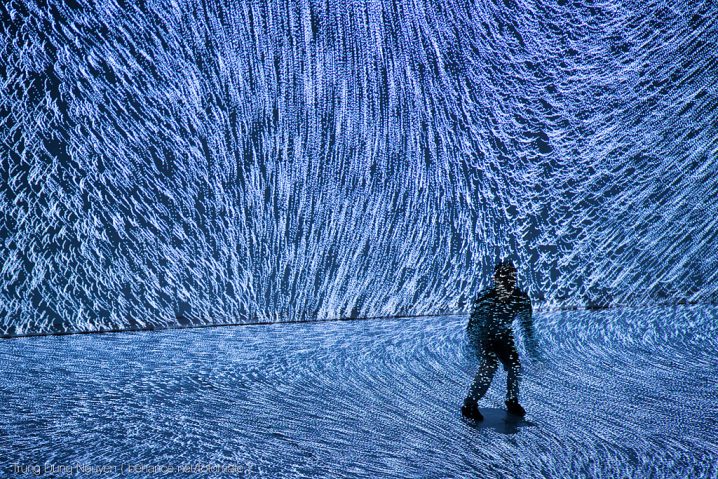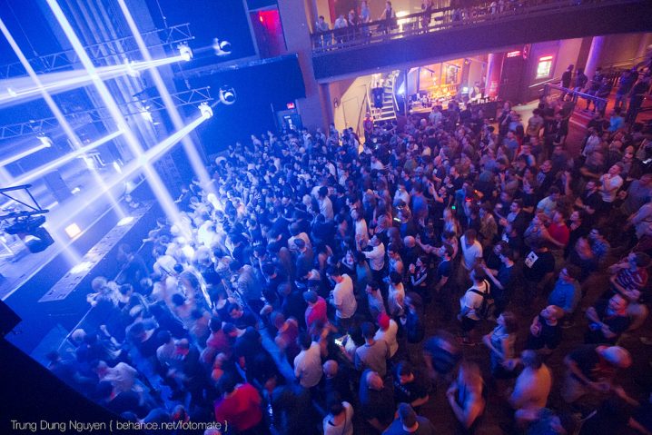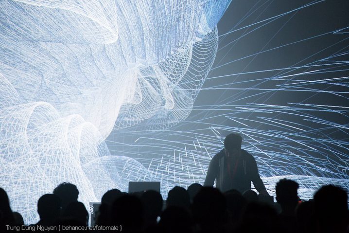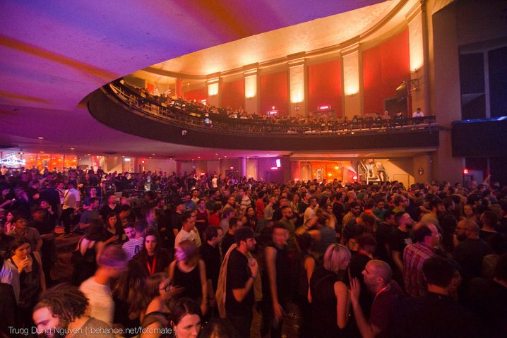 After a quick bite (you mustn’t forget to eat at the festivals!) I made my way over to Théâtre Maisonneuve for the first A/Visions showcase, titled Ballet Électronique. For an opening, Montreal-based Maotic & Metametric presented a collection of hypnotic generative visuals, inspired by “the concept and technological reality of ubiquity,” with optical illusions, kaleidoscopic patterns, and mesmerizing worm holes. This early evening performance hit its climax with a total sensory overload by a Japanese multidisciplinary artist, Hiroaki Umeda, who accompanied his multidimensional projections of fast moving pixels with digitally cut up high frequency glitches, and his very own body, dancing in the midst of reflecting screens, converging on interactions between movement and light. This was absolutely intense!