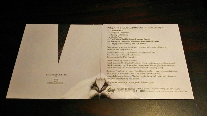 Collaboration borne of two artists sparking each other’s creativity is at the heart of The Prelude To, a new album by Pleq (Bartosz Dziadosz) and Giulio Aldinucci released on The Long Story Recording Company, a label formed from the ashes of Twice Removed, run by Gavin Gatling out of Perth, Australia. It all began when a demo of Aldinucci’s work was submitted to Dronarivm label (which Dziadosz curates), leading to the development of the title track, which first appeared as part of the monumental Home Normal’s Elements 5 compilation. Fortunately for us, the partnership blossomed and resulted in a complete album, with the addition of three new tracks and remixes contributed by The Green Kingdom, Christopher Bissonnette and Olan Mill.