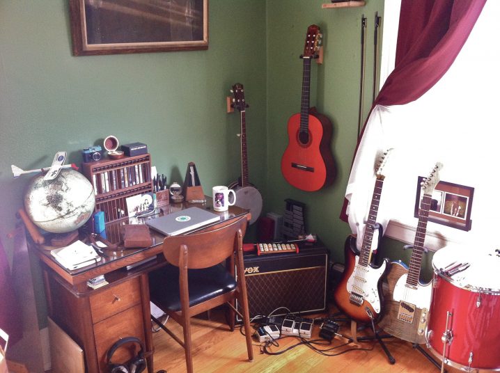 I’ve always kept it pretty spartan; as a teenager I recorded on a Tascam Porta02 4-track with a crappy Zoom 505 effects pedal and RadioShack microphone… I played an off-brand steel-string acoustic and an off-brand Gibson-style electric, and bashed on my drums just to make a sound. Nowadays I use a simple setup of 4 pedals including a loop station, as well as a Vox AC15 amp and a bunch of pretty decent Fender guitars, all recorded to tape and arranged in GarageBand because it makes more sense to me than most software I’ve encountered otherwise.