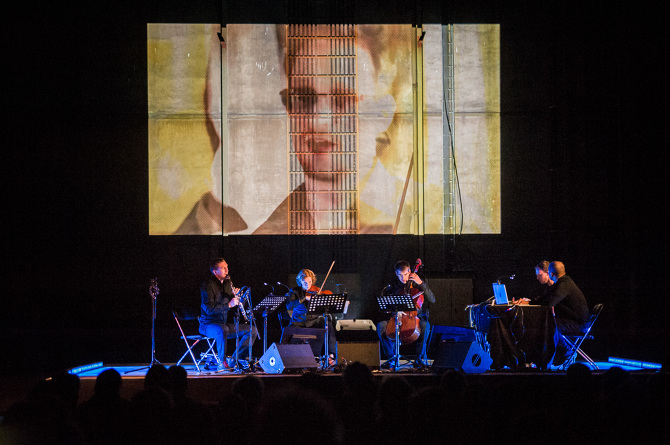 There’s a lot of (nervous) interaction between the string section, the clarinet performance and the (often distorted) electronic layers which suggest that they are grabbed directly from the invisible everyday data streams. Most of the visual message parts were pre-recorded, of course, but I could not help imagining the impact it would have had if the live performance would have included a real-time hacker grabbing material from the audience’s mobile phones and exposing them on a big screen during the performance!