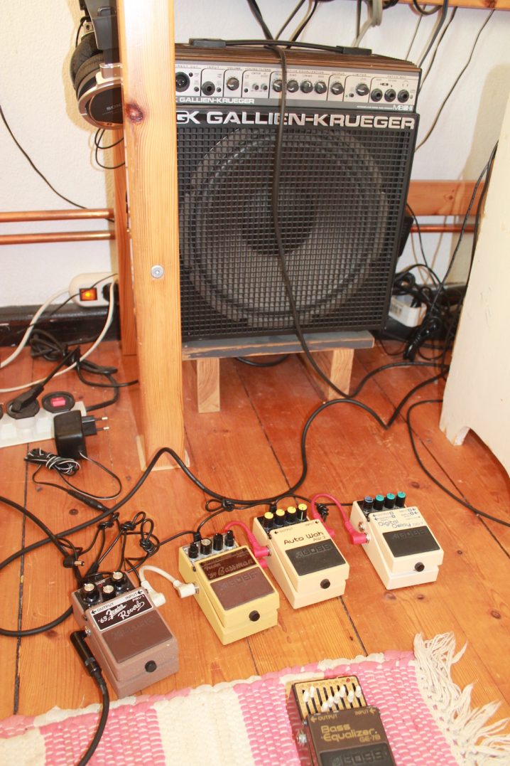 After that stereo cassette-player I had a four-track tape-recorder (YAMAHA) and then an 8 track digital-studio-workstation (ROLAND). Now I record on any PC, but I often still let the signal run through my VS880 or my Gallien-Krüger bass amp and my Boss-pedals. I guess I am a rather minimalistic kind of guy, I only have very few pieces of gear. I do not collect stuff. When I didn’t use something for a year then I dump it, I don’t want it to stand around. Too much material rather holds me, like, having a weight on your feet while you want to run.. I know that’s kind of luxury problem…