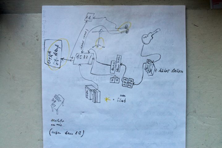 You can see my live setup as a sketch on the above pic. I bring the following: Classical Guitar, Boss-Bass-EQ (GE7B), Boss-DD6, Boss DD7, Boss-Bassman, Boss-Fender-Reverb, Roland R-05 wave-recorder, Boss-FV50 volume-pedal, Roland AC33 acoustic amp with built-in Looper. Then lots of tiny noise- and toy-instruments and finally, in case I bring the jazz guitar, I ask the club if they can provide me with a Fender-Twin-Reverb or a Roland-Jazz-Chorus. Oh man I really should get sponsored by Roland/Boss 😉