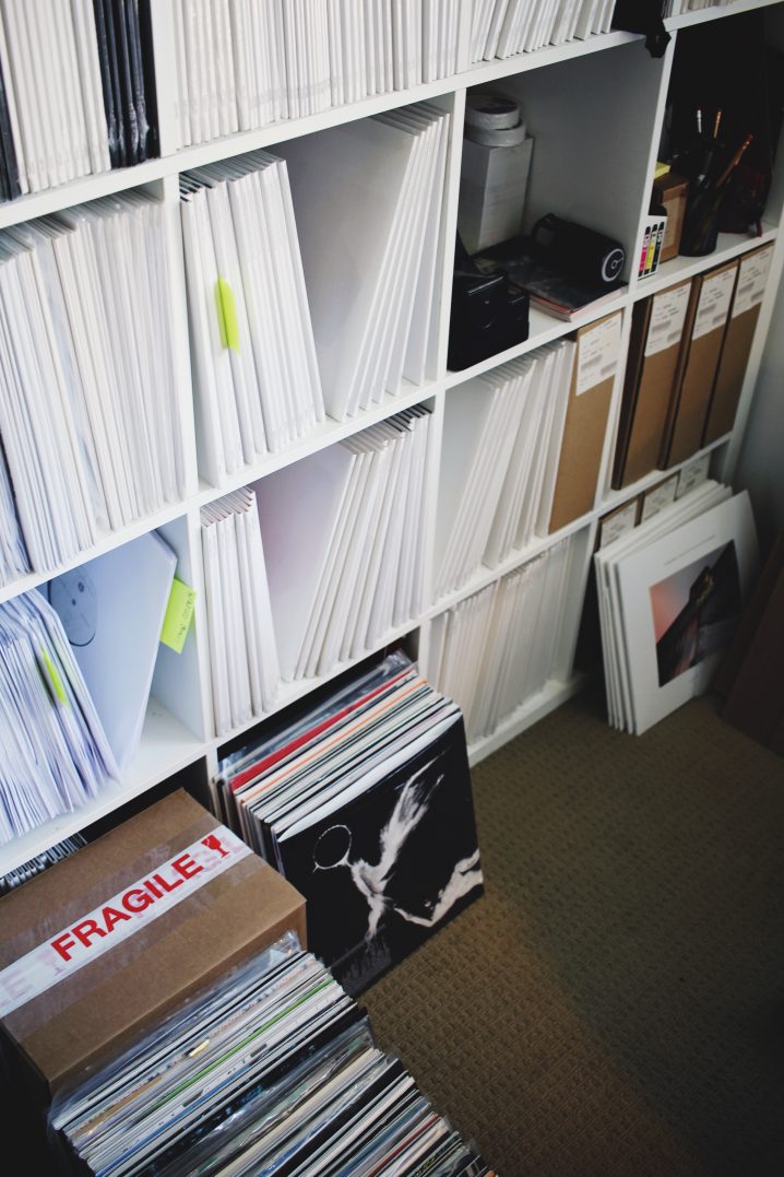 My ‘office’ space (if you can call it that) is where I keep my label stock, packaging, supplies etc and new records before filing with the majority of my collection. I say that, however, I don’t have much more space to move them around so they’re building up in the bedroom and not moving on from there! My office is where I listen to records more intently, check test presses etc. Here I have a Pro-Jekt Debut Carbon Esprit turntable, run through a pre-amp and another pair of Audioengine A5 speakers.