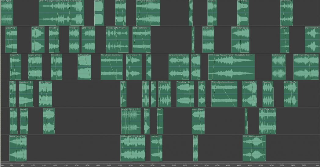 00:00 02:08 Areni Agbabian - Garun A Bloom, 2019, ECM 2549 00:52 01:49 Gideon Wolf - Self Portrait Replicas, 2019, Fluid Audio 060 01:37 01:26 Kammarheit - The Indefinite Vaults Drone Islands - Land Raising, 2019, Eighth Tower Records 02:43 01:34 Resina - Trigger (Abul Mogard Remix) Traces - Remixes, 2019, 130701/Fatcat Records LP1335 03:36 02:23 Craig Leon - The Twenty Second Step As Well As The Tenth Anthology Of Interplanetary Folk Music Vol. 2, 2019, RVNG Intl RVNGNL55 05:03 02:53 Angelina Yershova - Cosmotengri Cosmotengri, 2019, Twin Paradox 07:02 02:55 Ashtoreth - Elemental I Drone Islands - Land Raising, 2019, Eighth Tower Records 09:16 01:31 Robert Scott Thompson - Proximity Phonotopological, 2018, Acourant AWD 379561 10:10 02:42 Alla Zakaykevych - Voice/Way Kaleidoscope - Experimental Music From Ukraine, 2019, Flaming Pines FLP079 12:38 01:51 Snowdrops - Manta Ray Manta Ray OST, 2019, Gizeh Records GZH87 14:13 02:20 Zeno van den Broek - Interlude Two Breach, 2019, Moving Furniture MFR072 15:03 03:52 Jessica Moss - Fractals (Truth 4) Entanglement, 2018, Constellation CST138 18:28 02:55 The London Sound Survey - Maplin Sands Thames, 2019, Persistence Of Sound PS003 19:28 02:17 Rebecka Sofia Ahvenniemi - Winds Tacit-Citat-Ion, 2019, Ravello Records RAVL8011.2 21:08 01:58 Giulio Aldinucci - The Burning Alphabet Disappearing In A Mirror, 2018, Karl Records KR055 22:06 03:33 John Haniver - Black How To Live Like A Ghost, 2019, Linge Records LINGE089 22:20 00:44 Anxious Bot - Check The Basement Crystal Bible, 2018, self-released 23:38 01:56 Anxious Bot - Check The Basement Crystal Bible, 2018, self-released 24:20 03:25 Carl Stone - Kuk II Kwan (1981) Electronic Music From The Seventies And Eighties, 2016, Unseen Worlds UW15 26:07 01:22 Maxime Tanguay - Nain Field Sertraline, 2018, the end is near then012 26:53 01:44 Colin Stetson - Second Seance, Pt. 1 (+ Reversed) Hereditary OST, 2018, Milan M2-36952 27:42 02:06 Osa7209 - Osa 14 Orchestral, 2019, self-released 29:11 02:14 Sven Laux & Daniela Orvin - A Moment Of Silence The Writings, 2019, Dronarivm DR-59 31:00 02:33 Jane Antonia Cornish - Lux Constellations, 2018, Innova Recordings innova 006 32:28 02:34 Fiona Brice - Movement 1 (Holographic Field Rework) String Quartet No. 1, 2018, Bigo And Twigeti 34:44 00:58 Goncalo F. Cardoso - Radio Zanzibar Étude 1 Impressões De Uma Ilha (Unguja), 2018, Edições Cn ?ECN19 35:08 01:12 Juha-Matti Rautiainen - Void Above Me Weeps The Sky, 2018, Randomizer Media RDZCD05 35:20 02:26 Joseph Dugan - Sit In The Center Watching And Forget That You're There Swaha, 2019, self-released 35:32 00:50 The Books - Bonanza The Lemon Of Pink, 2003, Tomlab tom 32 37:15 02:36 Julia Kent - Through The Window Temporal, 2019, Leaf BAY 106CD 38:54 04:19 The London Sound Survey - Alhallows Marshes Night Thames, 2019, Persistence Of Sound PS003 39:03 07:40 Sleep Research Facility - Theta2Delta From Here To Tranquility Volume 9 - In Dreams, 2018, Silent Records 42:33 03:14 Sarah Davachi - Evensong Gave in Rest, 2018, Ba Da Bing! BING 137 44:31 02:39 Keru Not Ever - Équilibre De La Terreur The Wind Of ?, 2019, Infinite Machine IM071 46:04 02:52 Bas van Huizen - Torrewolk Kulverzuchter, 2018, Moving Furniture Records MFR063 47:40 01:32 Rafael Kolacki - Ra's A'Za. Hearing Ethiopia, 2017, Zoharum ZOHAR 154-2 48:20 02:00 Rauelsson - Mistral Mirall, 2018, Sonic Pieces 027 49:40 01:05 Rafael Kolacki - Ra's A'Za. Hearing Ethiopia, 2017, Zoharum ZOHAR 154-2 50:02 02:36 Deaf Center - Undone Low Distance, 2019, Sonic Pieces 028 51:54 02:55 Alla Zakaykevych - Voice/Way Kaleidoscope - Experimental Music From Ukraine, 2019, Flaming Pines FLP079 54:03 03:11 Martin Ptak - The Source River Tales, 2018, Col Legno WWE 1CD 20441 56:10 02:41 Dickon Hinchliffe - Return To The Forest Leave No Trace OST, 2018, Lakeshore Records