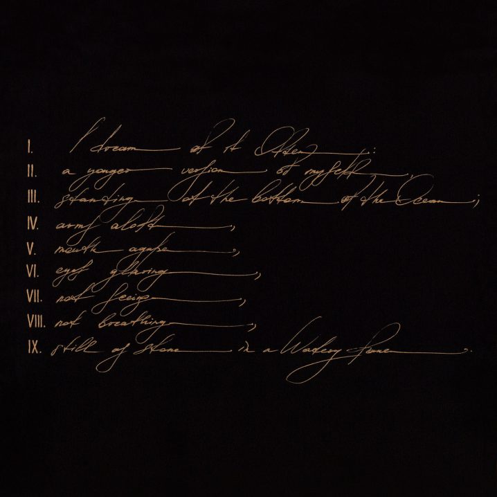 The album’s fragmented track titles relate a recurring dream that’s haunted Eustis since childhood, based on a murky incident during a family vacation to a remote Alabama coastline when he was eight. In the dream he swims alone through the waves past the sandbar to where the ocean shelf abruptly drops away into a gradient of infinite darkness; awed, he peers into the depths and sees himself down at the bottom, mouth open and eyes blank, standing motionless like a corpse.