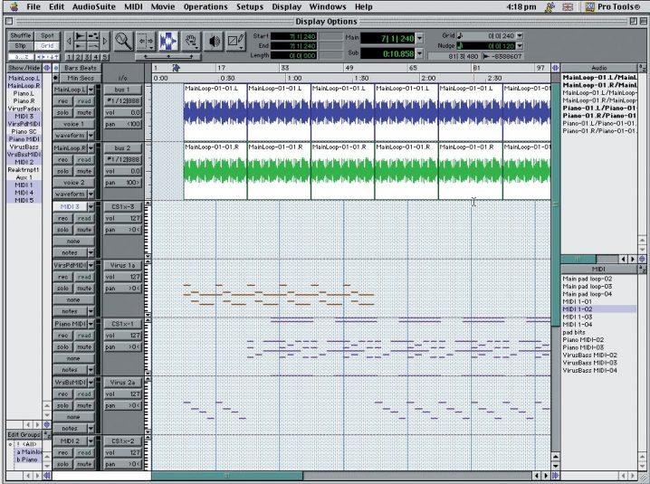 As computer-based digital audio workstations like Digidesign’s Pro Tools began to come down in price (driven by the massive advances in personal computer processing speeds in the mid-nineties), and as the major software sequencer developers began to add audio recording and sample editing functions to their already popular products, further innovations were on the way. MIDI, the communications protocol originally conceived as a way for a single keyboardist to control stacks of sound modules, found its real calling as the organizing principle of the computer music studio, linking software-based sequencers to the hardware universe of keyboard synths, sound modules, and samplers. Digital audio workstations (virtual multitrack recording studios) and sample editing software (stereo editors optimized for working with looped audio and featuring a wide variety of signal processing tools) brought a visual dimension to audio editing. Recorded tracks were displayed as graphical waveforms, making precise editorial work markedly simpler than it had been. Previously, trimming rhythmic loops had involved a fair amount of foresight and calculation: Graphical editing let producers make decisions on the fly and brought on, for better or for worse, a period of increasingly radical (or outlandish) editorial experimentation.