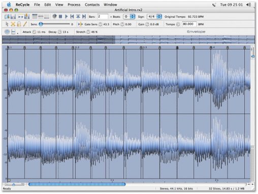 Much of their work depended on software sample editors like ReCycle, a software package developed by Swedish outfit Propellerhead Software (no, not those Propellerheads) and marketed by leading sequencer developer Steinberg. ReCycle analyzes a sampled drum loop that can then be chopped up into its component parts and reassembled, spliced, appended to itself, and otherwise mangled beyond recognition, all with greater speed, precision, and ease than could be accomplished using a hardware sampler alone. It enabled drum and bass producers to piece together their mutant percussion samples into continuously shifting polyrhythmic drumscapes. Pushed beyond their design parameters, pitch-shifting and time-compression operations produced digital noise that gave the drum sounds their characteristic hiss and crisp artificiality. While some popular breakbeats (the Winston’s “Amen,” for instance) have become clichés, radical digital mutations more often than not transform the source materials beyond easy recognition. Plenty of drum and bass records even employ the supposedly orthodox techno tones of 808s and 909s, but the results rarely resemble anything the Belleville Three might consider kosher.