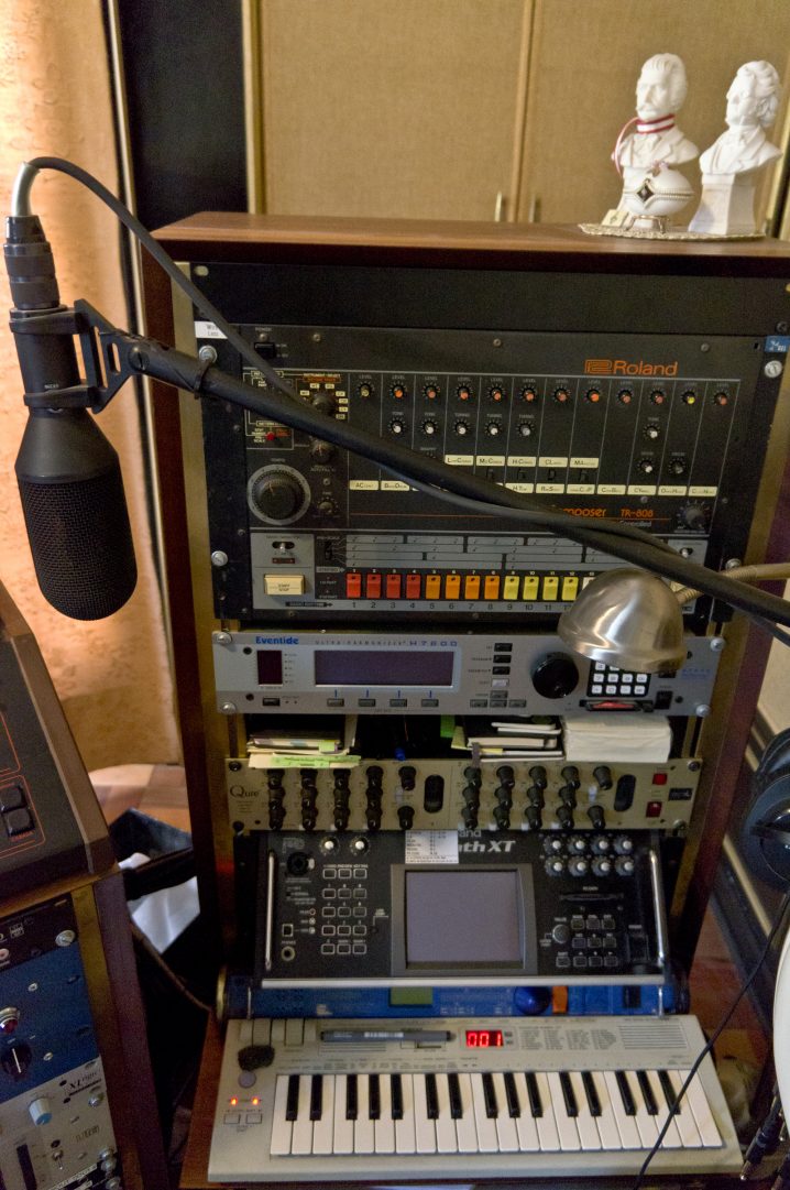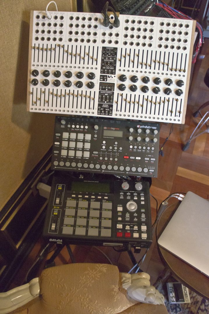 I would consider my work very much Protools based. I’m not into MIDI, nor into jamming or recording songs running multiple pieces of equipment linked/synced together. This is why no sequencer or drum machine is actually synchronised to any other machine or the computer. My method rather consists of constructing tracks within Protools, layering and overdubbing… replacing, refining, editing, and so on. I very often play instruments manually or program very simple things, either within Protools or on external machines. No matter how the material is generated, it then all ends up in a Protools session where it is being edited and put into place. If necessary it will be rerecorded, rather than trying to maintain sequencing/MIDI setup.