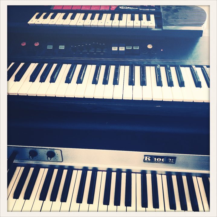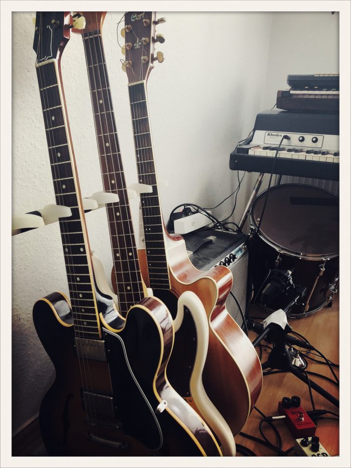 3. Rediscovering my old Gear from the basement + a new Guitar: Rhodes + Roland JazzChorus 120, Roland SH 101, Yamaha CP10, cheap little Casio and Yamahas from the Fleamarket. And I bought a Gibson ES 335 with fender Amp