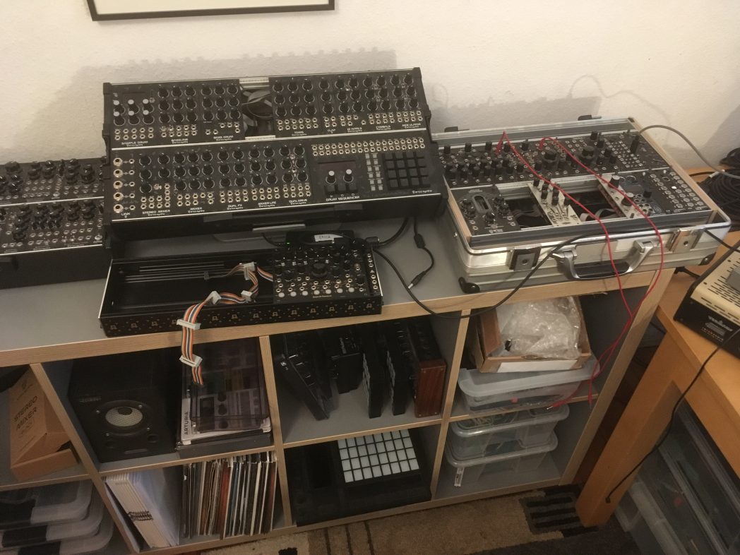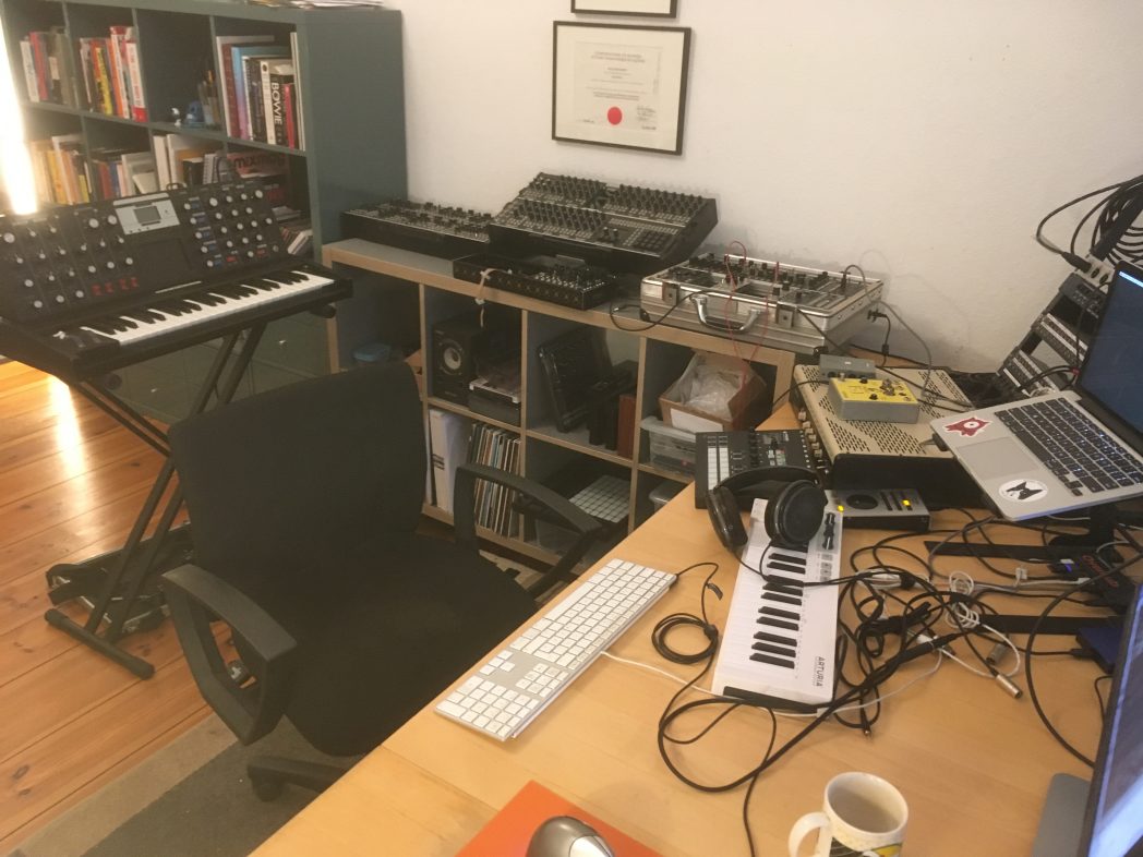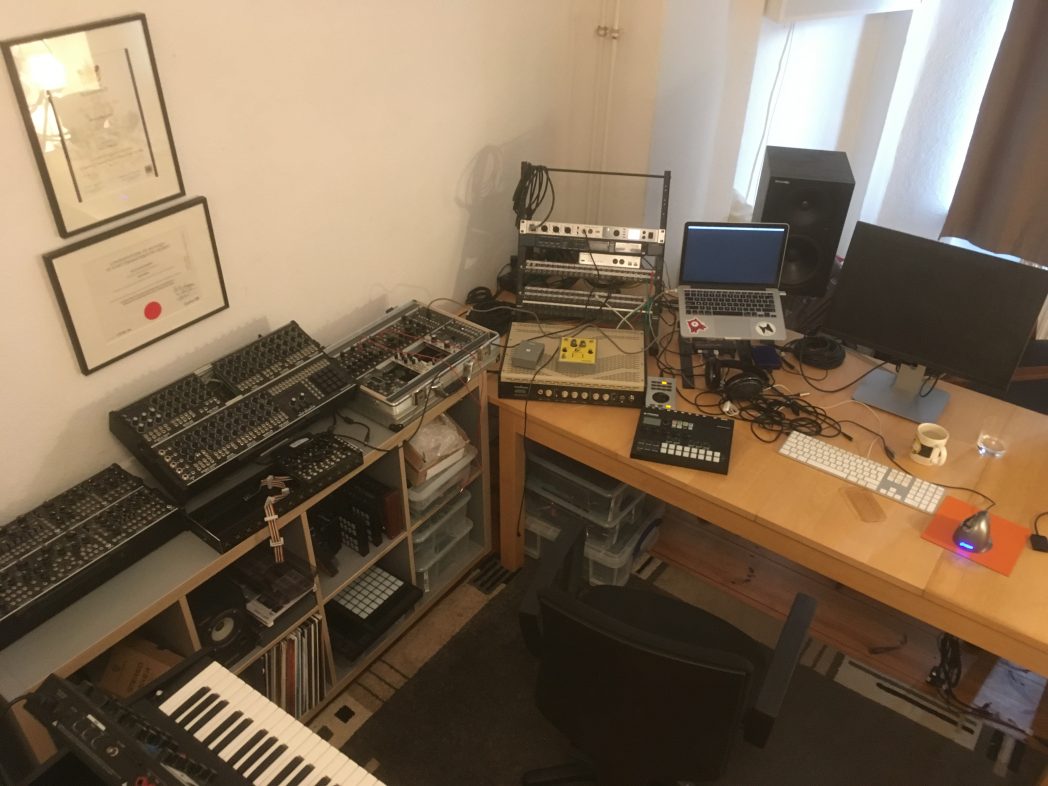The physical disposition of the workspace must follow the expressive requirements of my body. The workspace is a musical instrument. The same way a large church organ is set up to allow the performer to access the controls in a way befitting the musical language, my studio is set up to allow a musical flow between the tasks. That comes down to where cables are stored, what machines are permanently plugged in, how much desk space is kept free to allow me to crouch on the desk if I need to tweak a synth, how much space is available on the floor to lie down, listen and close my eyes. Some synths are higher up so I can stand up. I wish I had a motorized desk so I could change the height of all the instruments at all times. If dance music is about connecting people through their bodies and feelings, I better make sure that my creative process is also tuned in to my own physical movements. I had serious problems with tendonitis when I was playing the violin and later with the computer. I saw a physiotherapist for a while in music school. I learned about how my body works and some basics of anatomy, simple things like how the bones in the forearm twist and pinch a bundle of tissue, and small details about how I move my arm can have a significant impact on how my entire body feels after working in the studio for hours on end. I solved those problems years ago, it changed how I carry my body when I work at the computer.