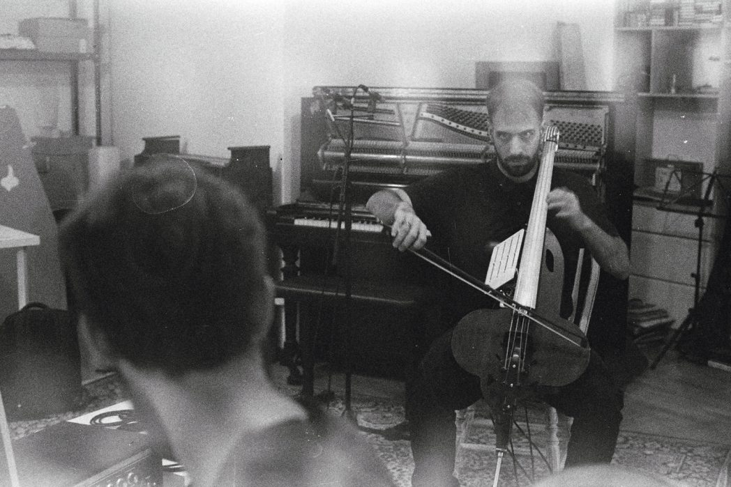 My press copy comes with a bunch of photos depicting the recording sessions with a bass clarinet, percussion, and the halldorophone cello. I’ve picked a favorite and featured it above. There is a stark contrast between the darkness on the record and the light that’s captured by the lens. Instead of an illuminated studio, my mind prefers to think of this recording made in the gloom, cold bowels of an abandoned church, a cave, or something old unearthed through ceremonies of a shaman. It’s where humanity has taken its final breath before exhumed again for one more chance in living.
