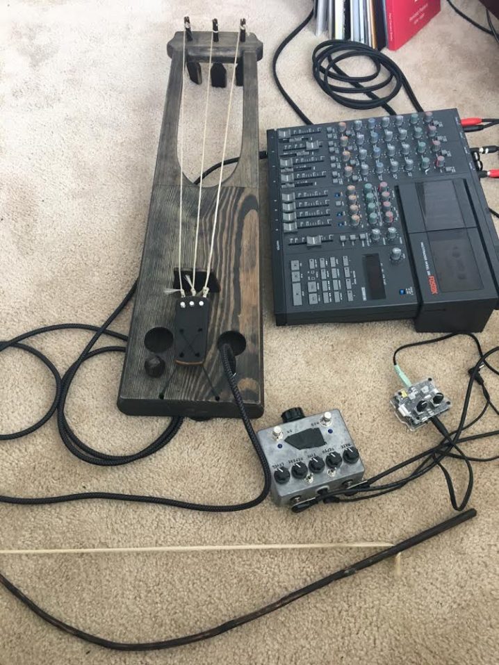 I had it custom-built by Petrozavodsk-based master Maksim Bunyaev, and it’s pretty unorthodox: kind of a mix between jouhikko and talharpa (its Scandinavian relative). Essentially, a 3-stringed jouhikko but with a deeper, lower sound. Strings are horsehair, and it detunes in a second, so I’ve worked out a technique of constantly retuning it while playing. It has a built-in contact mic so I plug it in electrically, and it feedbacks like crazy when close to amps. I love it. I started playing it because I wanted a string instrument, but most of the established ones are just too advanced for me, and have too much cultural baggage. Generally, my perfect instrument is just an amplified contact mic, so I thought: “hey, it’s just that, but inside a block of wood and with horsehair”.