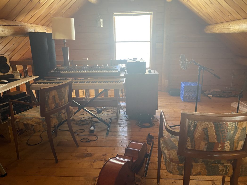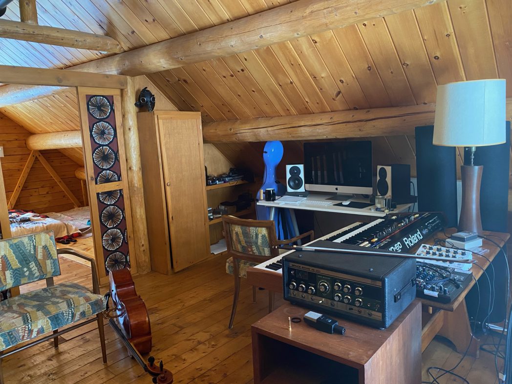 My studio has changed considerably over five years. Originally it was only a laptop, a pair of Yamaha monitors, a little Mackie mixer, my small pedal array, a DPA clip-on mic, an M-Audio key station and an Apogee Duet. Things improved from there gradually, but after lockdown a year ago, I decided I had to invest in some proper tools to create work from home. My first two full-lengths were done at Vox Ton studio in Berlin with Francesco Donadello; I would make demo versions of my compositions and then go there to re-record them, diving in and making better sounds, recording to tape, etc. Realizing I would need to be on my own and by my lonesome, I made some recent upgrades, including a Stam Audio SA-67 tube mic, an AKG C414, Chandler Tg-2 preamp, UA Apollo x6, Arturia Keylab and a Juno 60. I also splurged on an RE-201 which was refurbished by Soundgas in the UK. I recently moved from Brooklyn to the woods of upstate New York, so my studio is in the loft of a lovely log cabin. I bought a parlour grand Krakauer Brothers piano that is 100 years old.