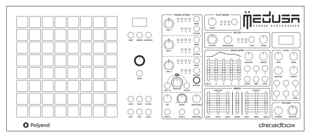 I purchased this little synth because I wanted something very different – and ‘different’ is exactly what I got. I feel like the Medusa is actually two separate things in one single desktop unit. On the left is a controller and a sequencer, courtesy of Polyend, while on the right is a ‘hybrid’ synthesizer combining digital and analog technologies, courtesy of Dreadbox (Polyend also furnished the digital oscillators). Hence the collaborative hybrid product between the two companies combining two together. But one of the main points I want to make is that I really do feel like I got two units in one – because I can happily use the grid to control, modulate, and even sequence any other instrument in my studio, while the synth is an independent module, a bit different from what I already have today. Both are unique enough for their own special talents, but together Medusa is a great little package for a very reasonable price. Since there is just too much to cover, for the purpose of this article I will only focus on the synthesizer portion of the unit. This article assumes that you know the basics of subtractive synthesis, and are familiar with sequencing, and a little bit of signal flow in a modular setup. If any of the below is unclear, just reach out and ask.