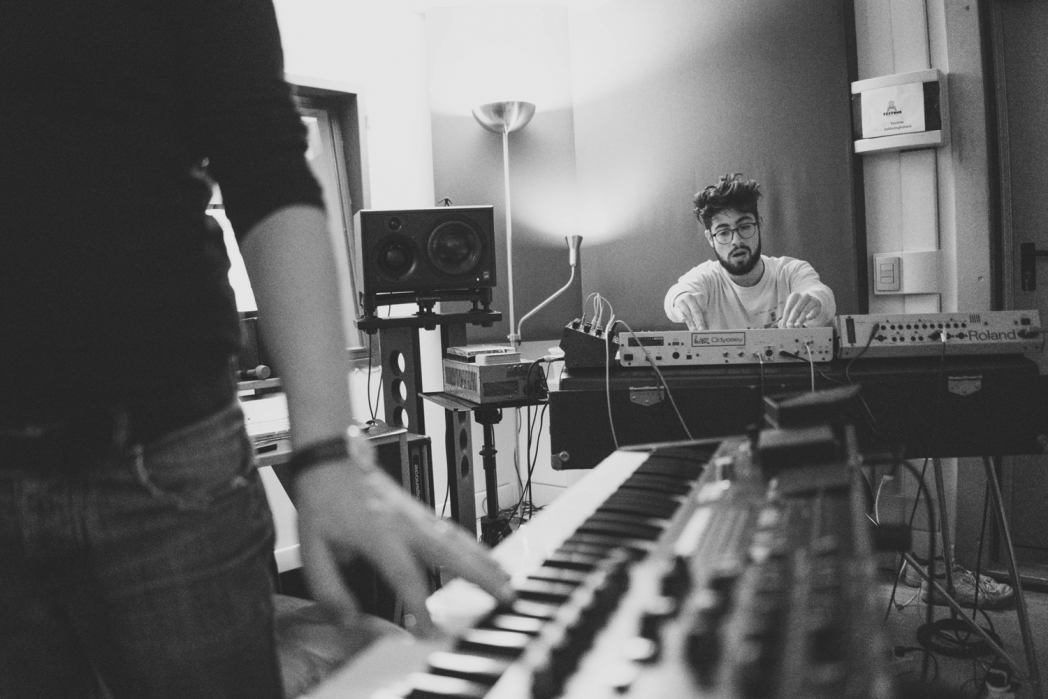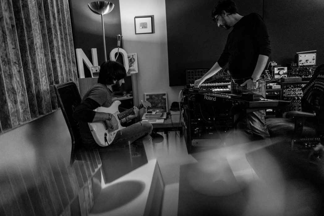 We currently work remotely, sharing ideas that are later mixed in Pro Tools. Matteo Cantaluppi uses different kinds of hardware (Moog Voyager, Prophet 6, Korg MS20, Tasty Chips GR1, Roland 808 and 909, Roland JX-3P, Eventide Space, Ottobit Meris, Avalanche Run by Earthquaker Devices, and lots of analog Compressors such as Empirical Labs Fatso and Urei 1178). Francesco Perra uses a complex stereo pedal chain featuring effects such as Strymon Bigsky, Timeline, Nightsky, Hologram Microcosm and Infinite Jets, Chase Bliss Dark World, Mood and finally, a Walrus Audio Mako ACS1 Amp simulator to connect directly in stereo to the audio interface or the tape multitrack recorder. Matteo Milea also has his studio where he experiments with recording techniques and different real and electronic instruments. At the moment, he uses a hybrid approach between live sequencing and recording. He uses the (Elektron) Machinedrum a lot as a central MIDI “Creator” and also for composing synths patterns; sometimes, everything is synced via MIDI I/O interface to the computer DAW (Ableton or Pro Tools), and for the soundcard, he uses an Apogee Quartet. He owns a couple of old synths like the Korg DW8000 and the Poly-Ensemble, Moog Mother 32, a small modular system with Doepfer, Mutable Instruments, Waldorf 2-Pole filter, a Binson Hi-fi 10w amp, and many pedals.