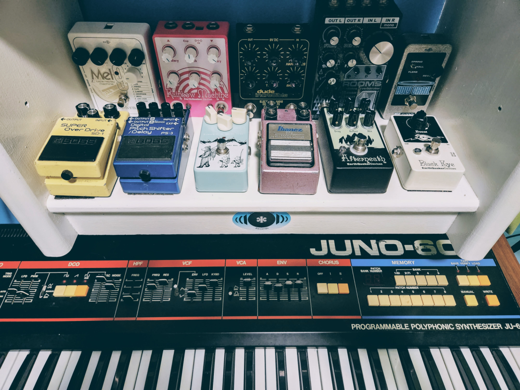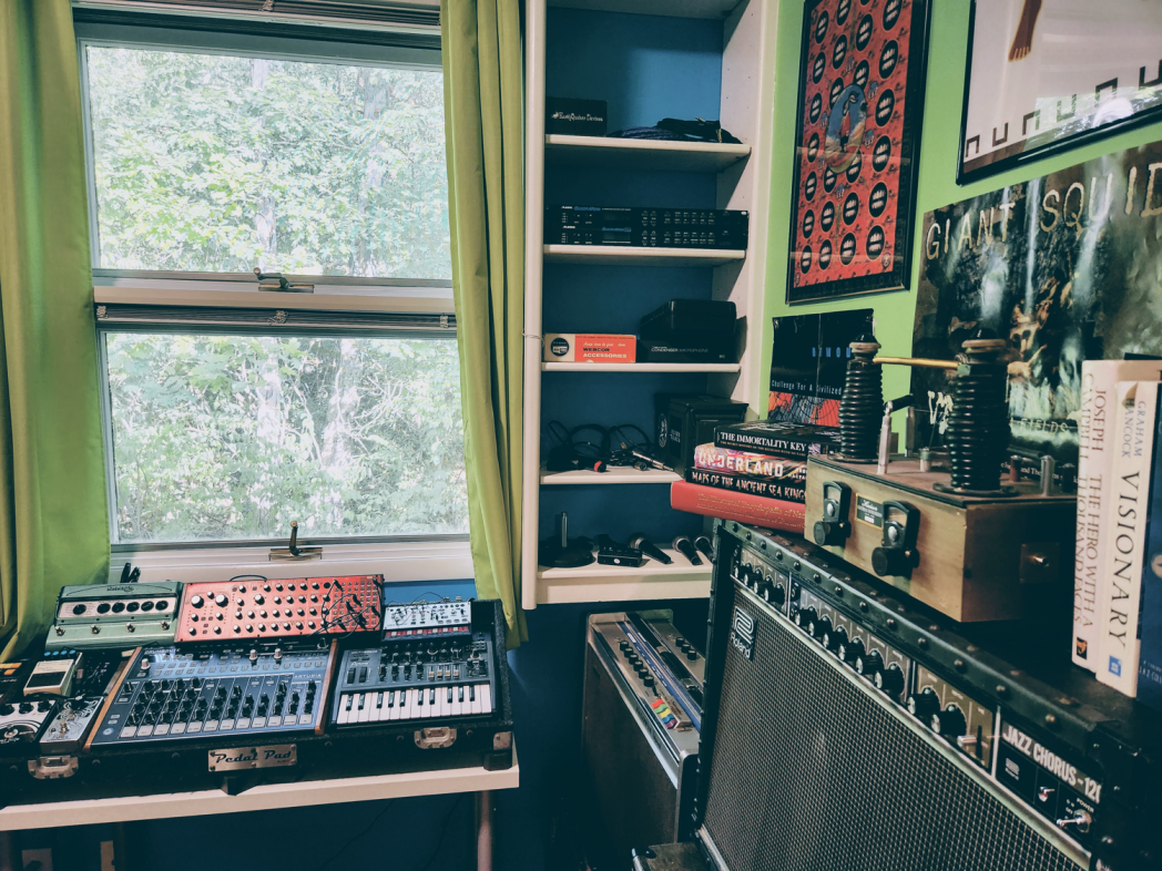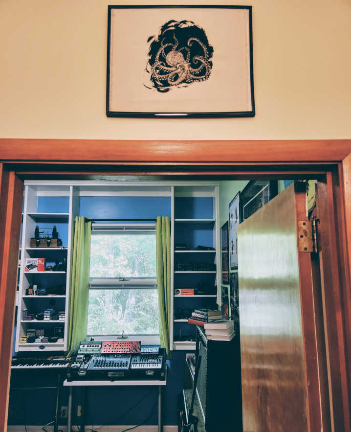 Well, the basics of my Octopus Pond Studio have remained the same for a bit, but I generally have practice disassembling my setup after I have finished work on a record. I guess it is a way to reset things to keep me from repeating the same processes that I previously used and spark some fresh creativity. Right now, have a Neve Preamp, Yamaha monitor speakers, multiple aluminum guitars, an ESP bass, Roland Space Echo, my trusty Roland Juno-60, a Drumbrute, Microbrute, a Roland Jazz Chorus 120, an old Baldwin Professional amp that has incredible and unpredictable spring reverb, an old upright piano, some modular synths, and loads of effects pedals, but my favorite right now is the Death By Audio Rooms stereo reverberator.