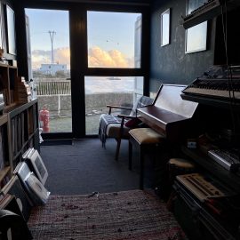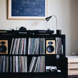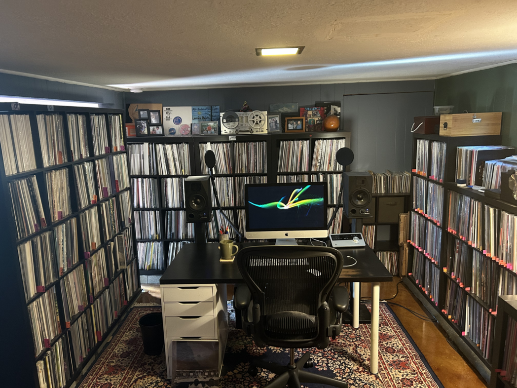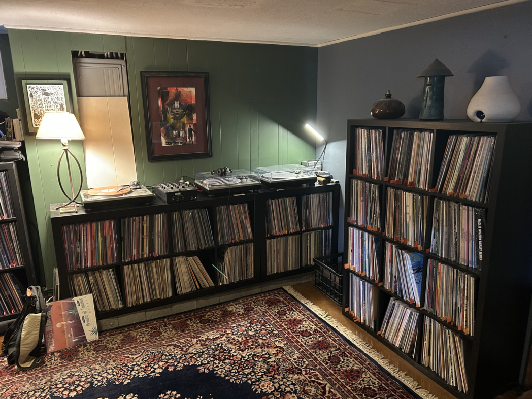 I have had a basic studio setup for ages: a pair of Adams A7 studio monitors with a smaller M-Audio sub (I’ll upgrade to an Adams at some point). My turntable setup shares the same section of my basement, 3 Technics (Ortofon needles) with a 3-channel Rane mixer that I use for layering records for my radio show.